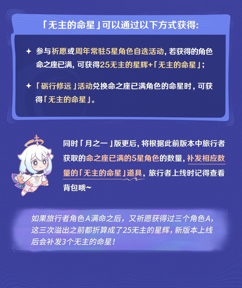 若在这两个活动中,玩家选择的五星角色恰好是已满命状态,同样会当场补发无主的命星。