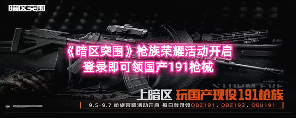 暗区突围推出「唯一代号——QBZ191」枪族荣耀活动。9月5日至7日,玩家每日登录即可领取一把国产191枪族枪械,连续登录三天免费获得QBZ191、QBZ192和QBU191三把枪械。现在就让羊托游的小编为大家带来关于《暗区突围》枪族荣耀活动开启,登录即可领国产191枪械的全部内容吧,感兴趣的小伙伴一定不要错过哦。