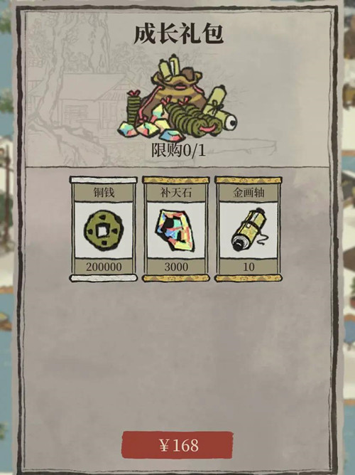 2、购买 60 元的月卡,不仅能直接获得 10 个金画轴,之后每天还能领取 50 补天石,坚持两个月也能攒够 3000 补天石;而且买月卡的这两个月里,每天都会有 5 张加速票可领,还能解锁仓库无限存建筑的权限,方便用多余建筑和严大人兑换物品、打造布局,整体非常合适;至于成长礼包里 20 万的铜钱,在游戏中花几个小时就能通过生产赚取,根本值不了成长礼包剩下的 108 元差价,所以更建议大家选择购买月卡。