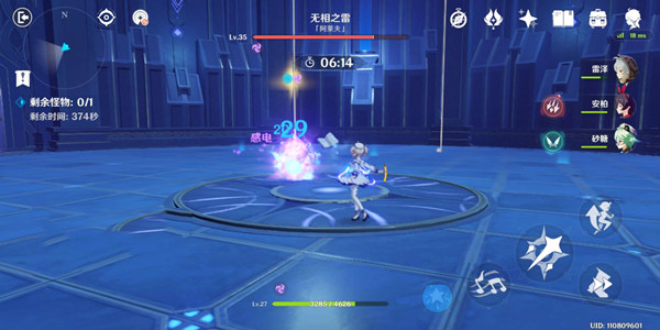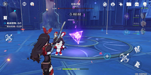 技巧:无相之雷最后阶段暴露的核心,需要用火元素攻击点燃,否则它会无限回血;这里用安柏直接射箭无法点燃,需先放置兔兔伯爵,再用弓箭攻击兔兔伯爵引发爆炸,借助爆炸的火元素点燃核心。