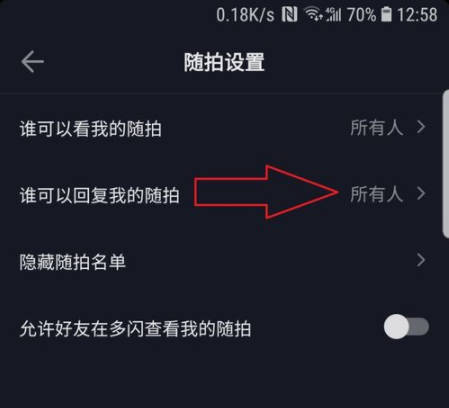 4、进入随拍设置后,找到“谁可以恢复我的随拍”这一项,点击进入进行设置。