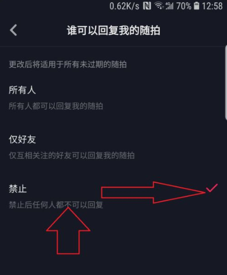 5、最后勾选最下方的“禁止”选项,这样就能彻底禁止任何人对你的随拍进行回复评论。