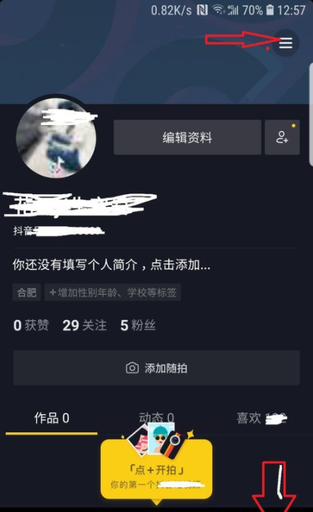 1、打开抖音进入主界面后,点击底部的“我”,然后再点击右上角的三个横线图标。