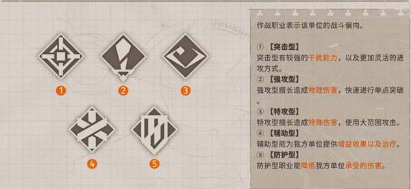 首先来说职业,游戏里总共有五种职业,分别是【突击型】、【强攻型】、【特攻型】、【辅助型】、【防护型】,每种职业都有自己鲜明的战斗风格和定位。