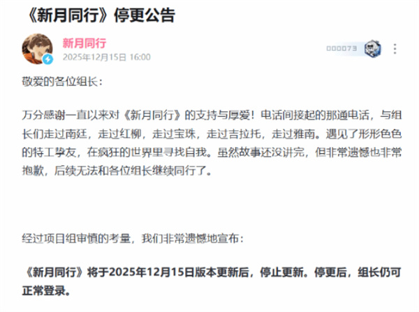 《新月同行》将于2025年12月15日版本更新后,停止更新。停更后,组长仍可正常登录。
