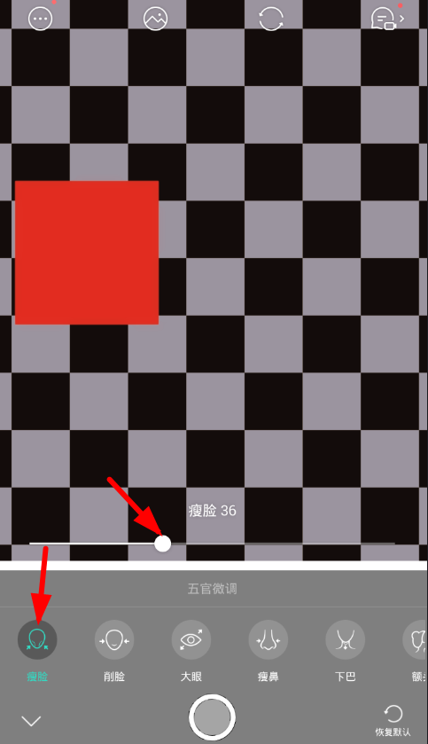 3、在五官微调页面的列表中选择“瘦脸”功能后,可以通过上方的进度条自由调节瘦脸的程度,直到达到满意效果。