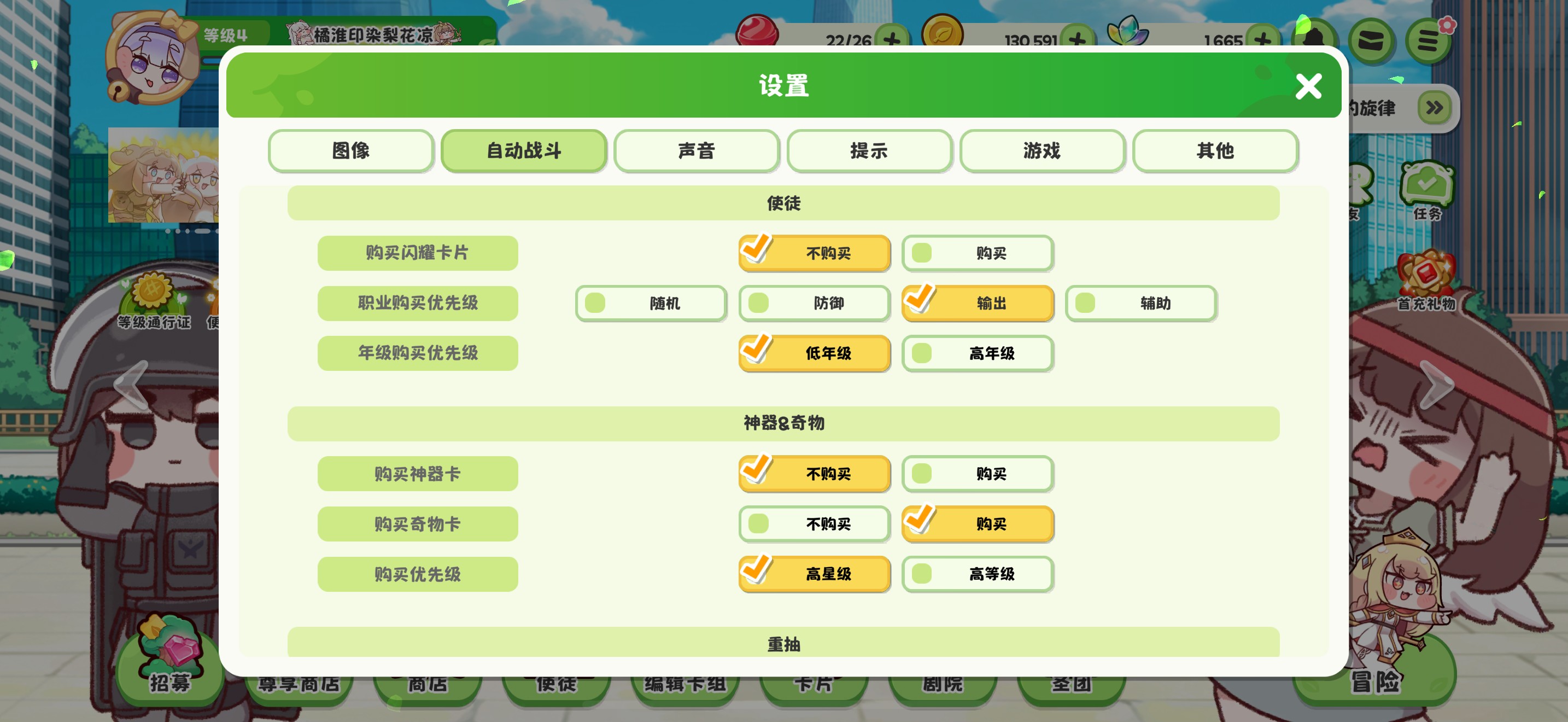 补充说明:购买神器的AI表现不佳,开启自动功能主要是为了推图稳定,因此建议把神器卡和闪耀卡先关闭,这两类道具变数太大,容易打断自动流程。