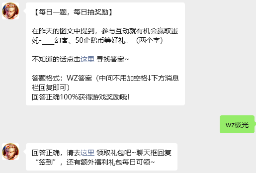 今日问题:在昨天的图文中提到,参与互动就有机会赢取蚩奼-____幻客、50企鹅币等好礼。(两个字)