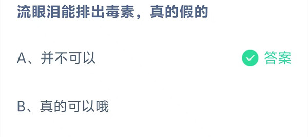 流眼泪能排出毒素,真的假的?这是今天《支付宝》每日一题的问题,相信我们很多用户都很想知道这个问题的答案是什么?这么一个可以领取饲料的机会相信我们很多用户都不想错过,这里羊托游小编为你带来了2025《支付宝》12月25日每日一题最新答案介绍(1)的全部内容,喜欢的小伙伴欢迎点击进入看看吧。
