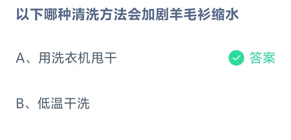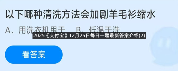 以下哪种清洗方法会加剧羊毛衫缩水?这是今天《支付宝》每日一题的问题,相信我们很多用户都很想知道这个问题的答案是什么?这么一个可以领取饲料的机会相信我们很多用户都不想错过,这里羊托游小编为你带来了2025《支付宝》12月25日每日一题最新答案介绍(2)的全部内容,喜欢的小伙伴欢迎点击进入看看吧。