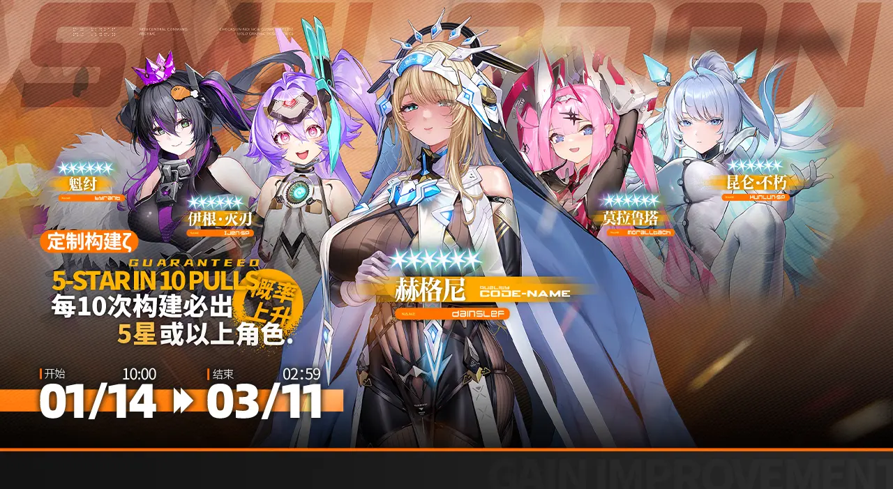 限时构建【辉耀灿金】、【彼岸艳色】、【挽弓逐星】、【诫勉呓语】、【定制构建ζ】即将开启,届时联域限定六星“洛贝拉”、碎星六星“赤夕”等强力队员登场,且构建获得该队员的概率将大幅提升!