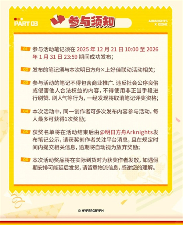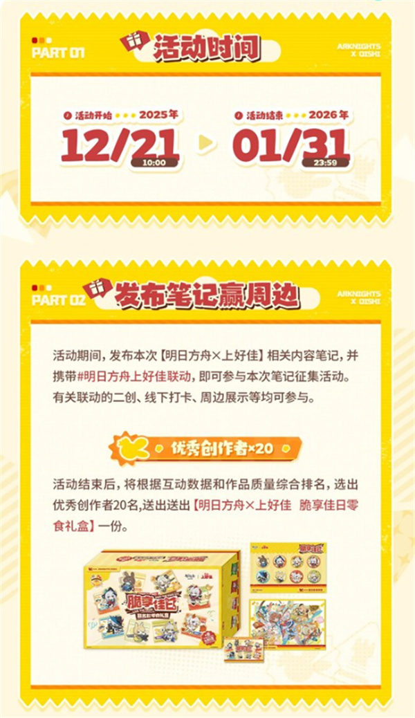 添加指定话题 #明日方舟上好佳联动 即可顺利参与评选,展现你的创作才华!