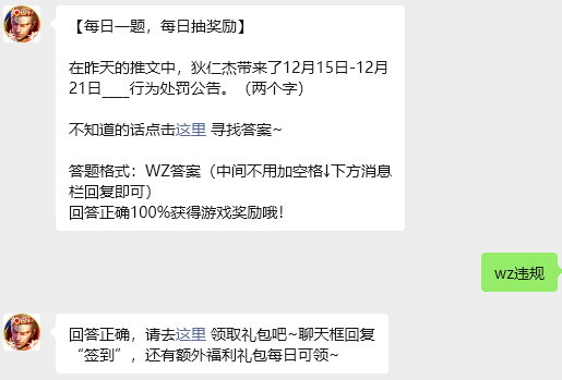今日问题:在昨天的推文中,狄仁杰带来了12月15日-12月21日____行为处罚公告。(两个字)