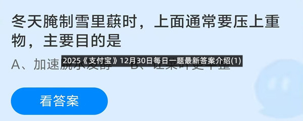 冬天腌制雪里蕻时,上面通常要压上重物,主要目的是?这是今天《支付宝》每日一题的问题,相信我们很多用户都很想知道这个问题的答案是什么?这么一个可以领取饲料的机会相信我们很多用户都不想错过,这里羊托游小编为你带来了2025《支付宝》12月30日每日一题最新答案介绍(1)的全部内容,喜欢的小伙伴欢迎点击进入看看吧。