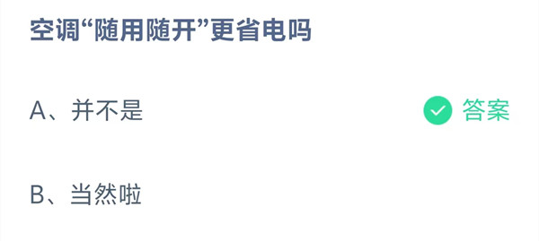 空调“随用随开”更省电吗?这是今天《支付宝》每日一题的问题,相信我们很多用户都很想知道这个问题的答案是什么?这么一个可以领取饲料的机会相信我们很多用户都不想错过,这里羊托游小编为你带来了2026《支付宝》4月2日每日一题最新答案介绍(2)的全部内容,喜欢的小伙伴欢迎点击进入看看吧。
