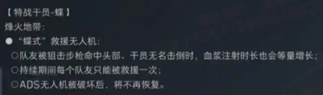 1、“蝶式”救援无人机:当队友被狙击步枪击中头部或干员无名被击倒时,血浆注射时间将等量增加;每个队友在持续期间仅能被救援一次,有效限制过度救援能力!