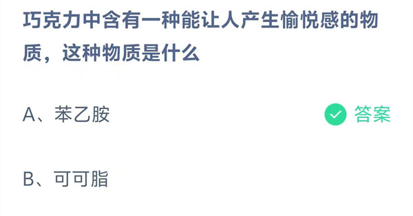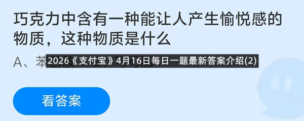 巧克力中含有一种能让人产生愉悦感的物质,这种物质是什么?这是今天《支付宝》每日一题的问题,相信我们很多用户都很想知道这个问题的答案是什么?这么一个可以领取饲料的机会相信我们很多用户都不想错过,这里羊托游小编为你带来了2026《支付宝》4月16日每日一题最新答案介绍(2)的全部内容,喜欢的小伙伴欢迎点击进入看看吧。