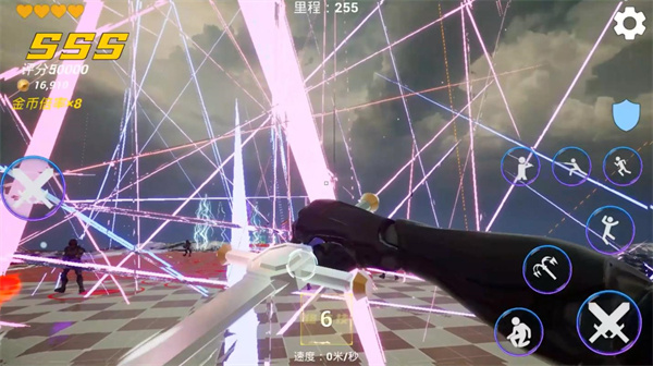 1、进入游戏即开启第一人称跑酷,角色自动前进,右侧设攻击、钩索、跳跃等按键,操控直观。