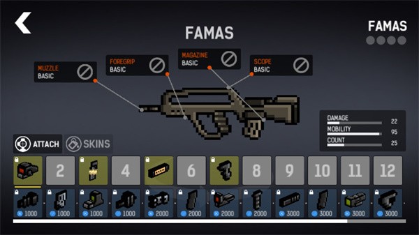 3、武器零件可购买升级,前期先战斗攒金币,再解锁配件。