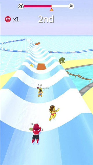 水上乐园大作战是一款非常有趣的休闲跑酷手机游戏。在游戏中,玩家将与15个朋友一起加入水滑梯。从最初的位置开始,他们将充分利用赛道上的水流和加速项目来争夺排名。同时,在游戏的中途,游戏改变了传统的跑酷游戏模式。玩家可以冲出跑道,然后在空中滑行。如果他们在飞行过程中成功降落在水滑梯上,他们就可以继续比赛。