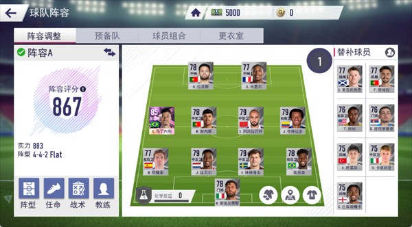 在球队阵容管理中,你可以自由调整阵型(如 4-4-2 Flat)、安排球员位置、制定战术策略以及选择合适的教练。同时需要关注阵容评分和球员之间的化学反应,以最大化优化球队的整体战力。