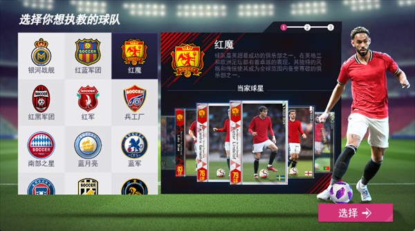 选择你希望执教的球队,可挑选如“红魔”等风格迥异的队伍。不同球队拥有各自的当家球星和独特背景故事,选队时可以结合个人喜好以及对球队风格的偏爱来做决定。