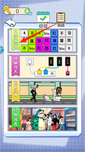 2、在模式选择页面中,找到并点击“文字挑战”这一趣味玩法,体验文字节奏的乐趣。
