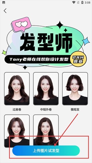 3、【发型师】页面看【过肩卷】等样式,点击【上传图片试发型】。