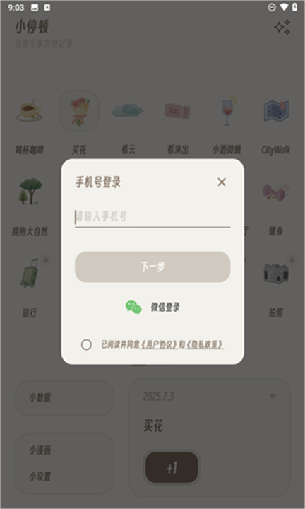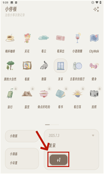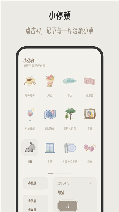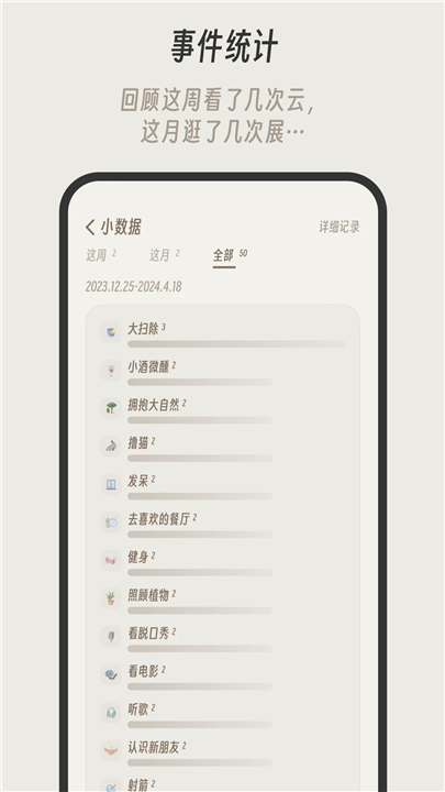 小停顿支持自定义添加小物品,以适应每个人不同的生活节奏和情感偏好,事件统计功能可以查看签到次数、类型分布和连续天数,帮助建立积极的习惯,每次签到后,都会有一个说明性的反馈,以加强情感联系,增强使用它的幸福感,日志功能支持添加文字注释,记录当下的情绪片段或微妙感受。