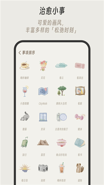 4、提供了超过50个“治愈小事情”模板,允许你自由签到并自动记录完成时间和频率。