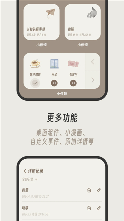 3、小停顿记录的事件可以添加到桌面小部件中,方便每个人随时记录。