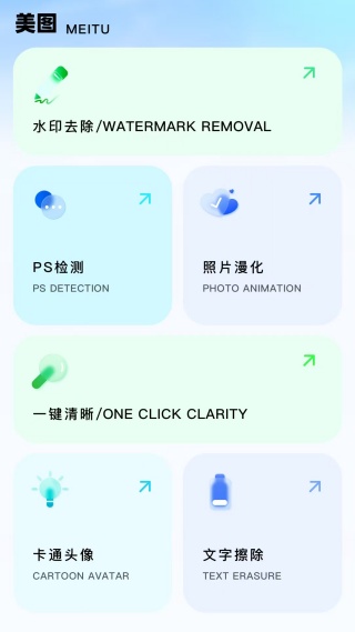 2、美图模块支持 PS 检测、照片漫化,还能一键生成清晰卡通头像及擦除文字。