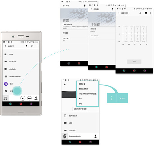 4、进入 APP “设置” 选项,可调节所连设备的均衡器、音质等参数,部分功能需设备支持,具体以实际显示为准。