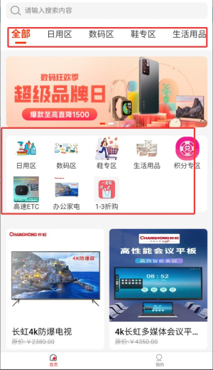 1、设立八大品类展区,包括办公用品、家用电器、食品饮料等。每个类别都配备了多个价格范围。