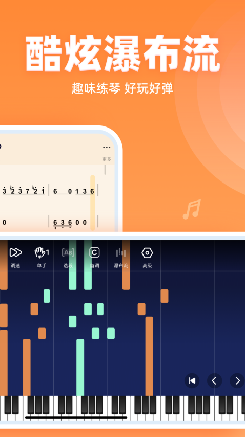 3、设计了一个非常酷的瀑布流钢琴页面,让您在钢琴练习中体验更多乐趣。