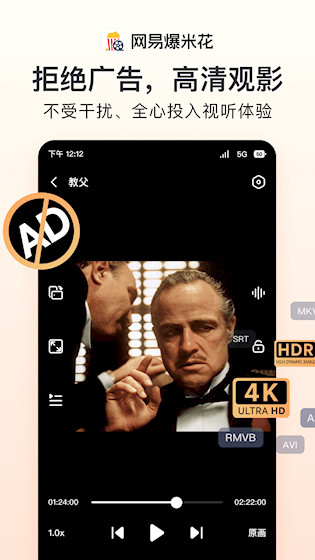 网易爆米花是一款具有抓取功能的视频播放器移动软件。所谓抓取功能,是指对影视文件进行自动识别,并在线获取海报、片名、导演、演员、编剧等相应信息,使本地影视文件的管理更加便捷。目前,网易爆米花应用支持直连阿里云盘、百度网盘等。它支持WebDAV和SMB协议,以及200多种音频和视频字幕编码。你可以流畅地播放4K、HDR和其他超高清视频,而无需下载。还可以聚合电影、电视剧、综艺等丰富的影视资源,追求不受任何广告干扰的纯视听体验。